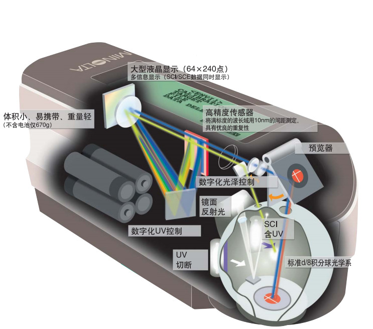 CM-2600d/2500d便攜式分光測色計(jì)是將性能優(yōu)良、使用方便的測色計(jì)以輕便小巧的方式推向市場的測量產(chǎn)品。可準(zhǔn)確測量應(yīng)測定的位置。擁有明亮的取景器和攜帶方便的時尚機(jī)身。雖然是便攜式分光測色計(jì),但卻可以在8mm和3mm的測量口徑間轉(zhuǎn)換。請根據(jù)樣品尺寸進(jìn)行選擇。攜帶方便的機(jī)身和明亮的取景器可以迅速、準(zhǔn)確、方便地捕捉到測量位置。可以各種角度測量。機(jī)身小巧輕便、機(jī)盤操作靈活、大型液晶顯示。CM-2600d 以電池驅(qū)動,可方便地調(diào)節(jié)方向至合適的測量角度,甚至可以從上方進(jìn)行測量。清晰的大型液晶顯示再加上旋轉(zhuǎn)顯示功能的使用,在將該分光測色計(jì)從一只手轉(zhuǎn)移到另一只手時也可以很容易地看清顯示的內(nèi)容。此外,"導(dǎo)航滾輪"功能使得設(shè)置操作簡單易用。優(yōu)異的可靠性和耐用性。追求免維修化的設(shè)計(jì)理念。數(shù)字技術(shù)的引入可盡量減少活動部件的數(shù)量。