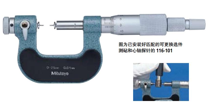 多功能千分尺 116 系列 — 可更換測砧型,Mitutoyo 116系列多功能千分尺在度量單位中有一個游標(biāo)刻度,用于測量精確的外徑(OD)測量,并用于各種應(yīng)用的 7 個可更換測砧 (平面型、花鍵型、球面型、尖型、刀刃型、盤型和薄片型)的非旋轉(zhuǎn)心軸。在調(diào)整過程中,它也有一個棘輪鎖定裝置,可保持恒定測力,以及在測量時幫助提供穩(wěn)定定位的非旋轉(zhuǎn)主軸。