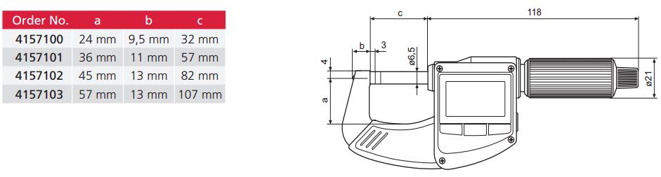 | 訂單號(hào) | 測(cè)量范圍 mm | 測(cè)量范圍 inch | 數(shù)字增量(mm/英寸) | 誤差限度 μm | 軸直徑 | 軸螺距_mm | 測(cè)量力 (N) |